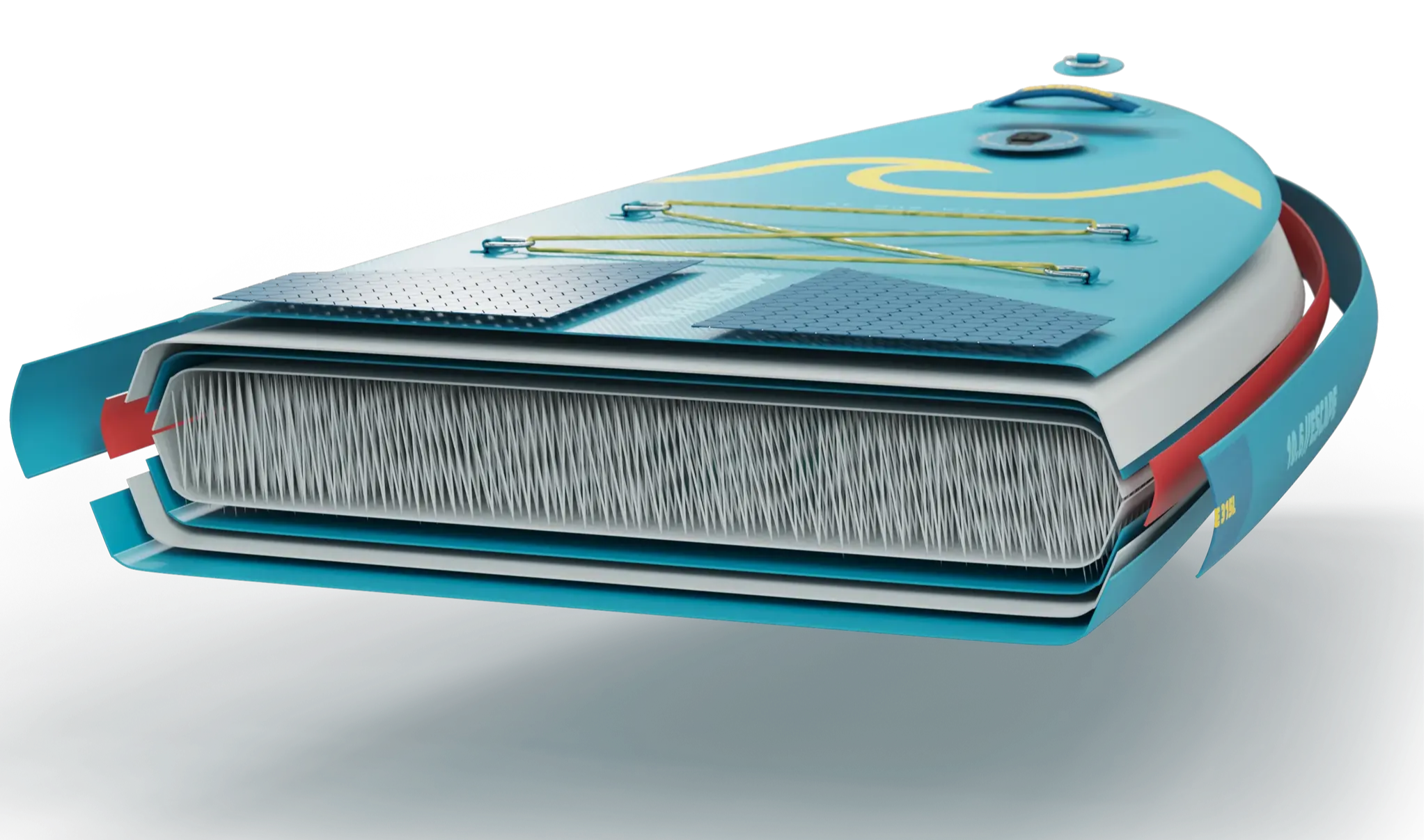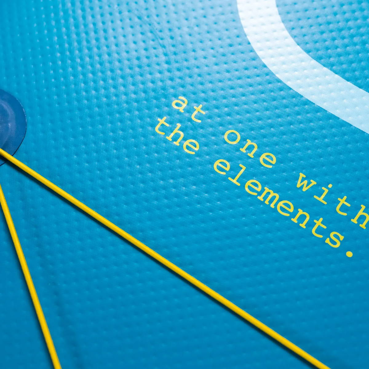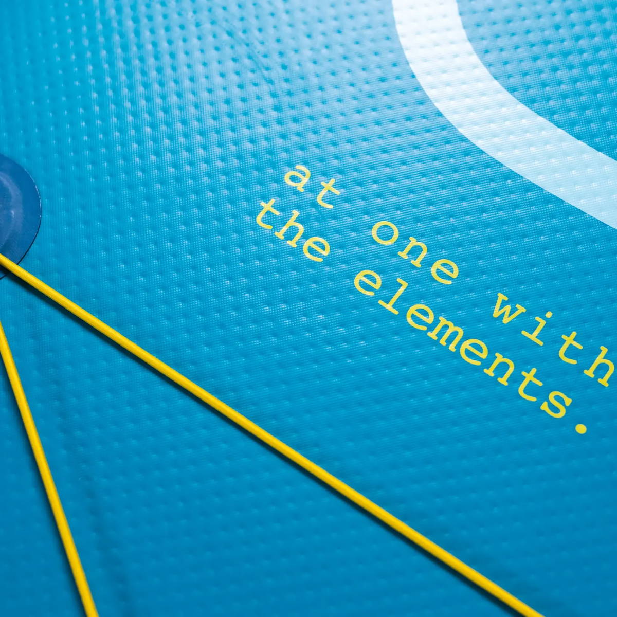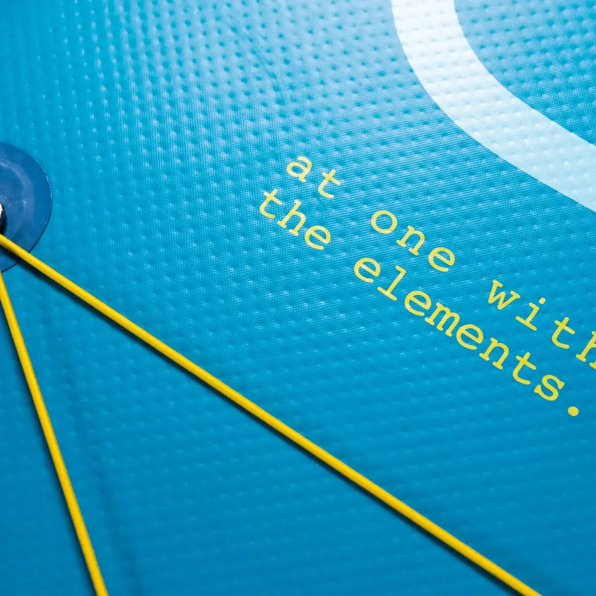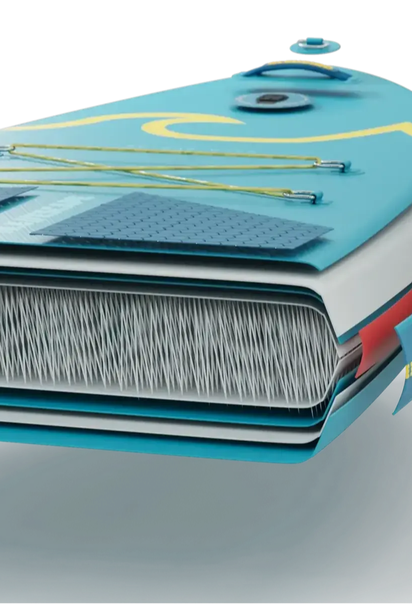 The inner thread structure is first laminated with our high-density PVC thermoplastic polymer. This fuses the 1000 denier polyester weave of the substructure, ensuring optimum torsion stiffness under pressure once inflated. To this we then add our PVC outer skin, giving the board its airtight membrane. Those dimples you see on the outside of the board; these are thousands of threads which run inside our SUPs to give the board its shape and structure once inflated.