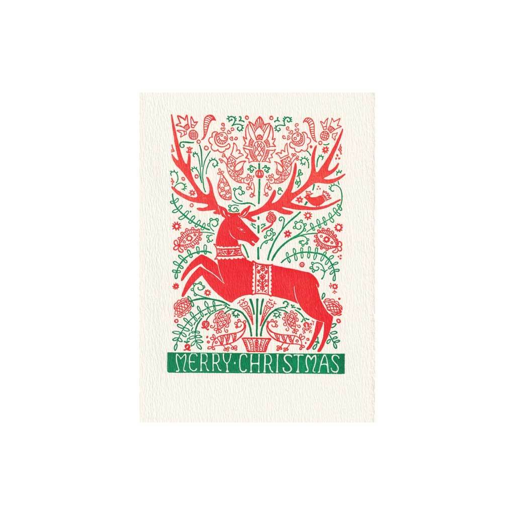 Send warm Christmas wishes with this festive forest friend. This charming Saturn Press holiday greeting card features a letterpress-printed, folk-art inspired design of a reindeer framed by ornate ornaments and classic red and green motifs.